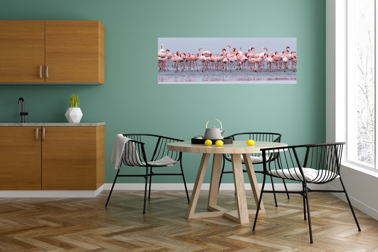A flock of greater flamingo (Phoenicopterus roseus) and lesser flamingo (Phoeniconaias minor) foraging - Walvisbaai, Namibia.