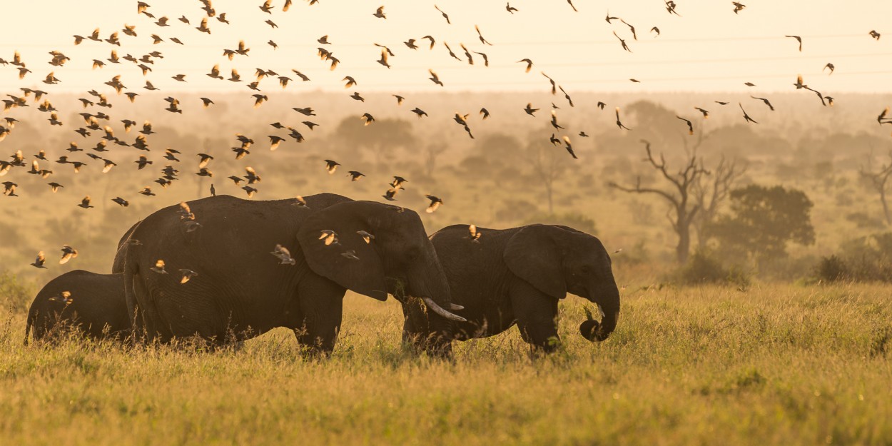 African elephants grazing in their natural habitat. Whith their movement through the grass they "kick up" the birds. The backlight of the setting sun make the wings of the birds translucent - Kruger Np, South Africa.